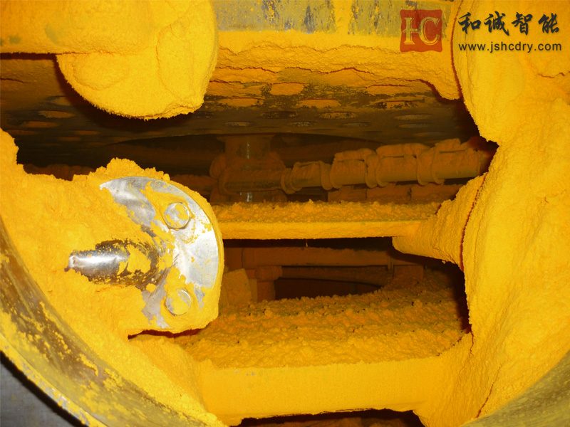 ② 盘干机积料多,加热盘反面、耙杆、加热管热源进出管道、筒体和上盖内壁都容易积料;