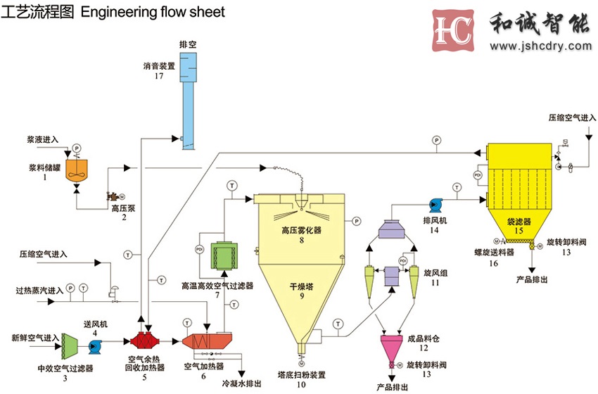 离心喷雾干燥机为热风循环、并流式、离心式雾化干燥机。干燥介质空气通过初、中效空气过滤器过滤,由加热器加热后,进入干燥器顶部空气分配器,热空气呈螺旋状均匀地进入干燥室。液体物料经过料液泵,输送到塔体顶部的高速离心雾化器,在离心力作用下喷雾成极细微的雾状液滴,与热空气并流接触,在极短的时间内可干燥为成品。成品连续被干燥塔底部和旋风分离器收集,尾气除尘后由引风机排空。