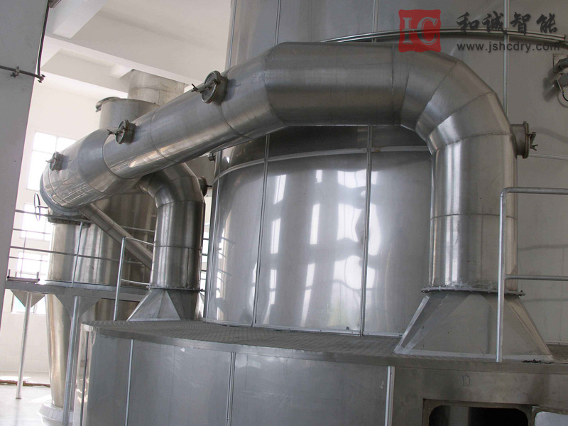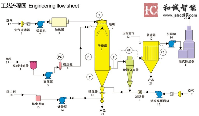 将溶液、乳浊液、悬浊液或浆料在热风中喷雾成细小的液滴,在它下浮过程中,水分被蒸发而成为粉末状或颗粒状的产品。在干燥塔顶部导入热风,同时将料液用高压泵送至塔顶,经过雾化器喷成雾状的液滴,液滴与高温热风接触后水分迅速蒸发,在极短的时间内便成为干燥产品,从干燥塔底部排出。热风与液滴接触后温度显著降低,湿度增大,作为废气由排风机抽出,废气中夹带的微粉用分离装置回收。