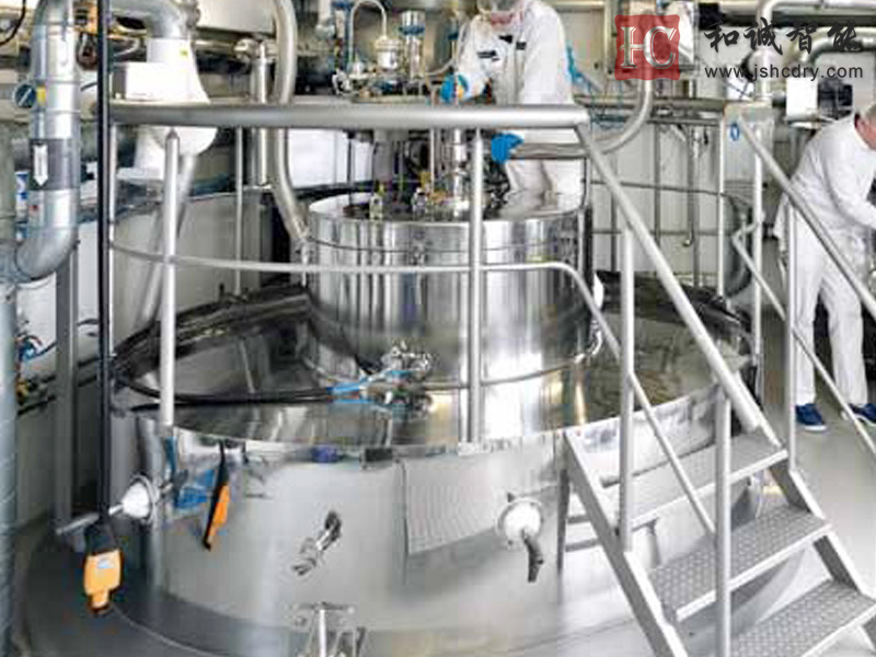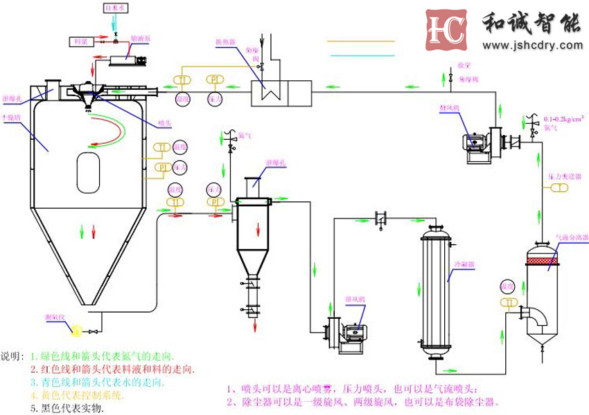 防爆型闭式循环离心喷雾干燥系统是在密闭的环境下工作,干燥介质为氮气之类的惰性气体,干燥塔内为正压操作,若内部压力下降,压力变送器就能自动控制氮气进入量,以保证系统压力平衡。由于,采用氮气作为循环载体,对干燥的物料具有保护作用,氮气之类的循环载体起着载湿、去湿和循环传递的作用,其载体介质可重复使用。然而,常规的普通的离心喷雾干燥是通过不断的送风、排风达到排湿的目的,其塔内控制为负压操作,这也是防爆型闭式离心喷雾干燥系统与普通离心喷雾干燥系统的明显区别。因此,防爆型闭式循环离心喷雾干燥系统特别适用于对有机溶剂的物料干燥、有毒气的物料以及干燥过程中易发生氧化等物料的干燥。