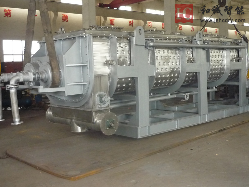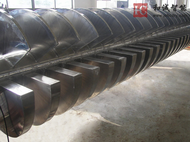 当干燥到含水率60%左右时,物料极易结块、表面坚硬、难以破碎、而里面却仍是滤饼状,这给类似物料的进一步干化带来极大的困难;另一方面在干燥类似物料过程中,物料容易抱轴,从而把桨叶和轴的散热面包围 转动时一起运动,这样干燥的效果比较差。为了克服这个困难,我们又对干燥机进行了改进,在筒体内部增加一些装置,使结块后的物料容易破碎,从而干燥速度大大提高。