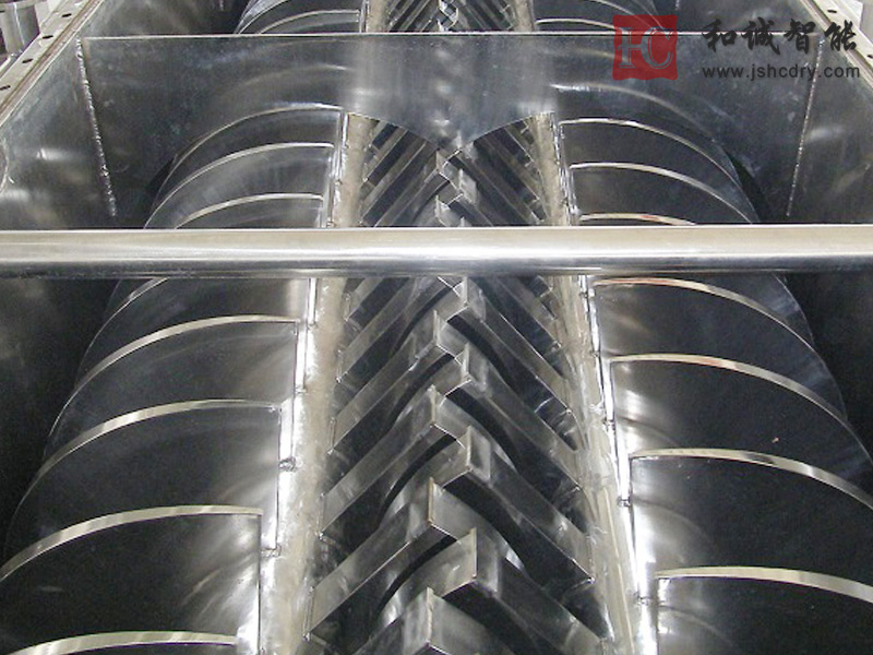 桨叶干燥机以蒸汽、热水或导热油作为加热介质轴端装有热介质导入导出的旋转接头。加热介质分为两路,分别进入干燥机壳体夹套和桨叶轴内腔将器身和桨叶轴同时加热,以传导加热的方式对湿物料进行加热干燥,被干燥的湿物料由螺旋送料机定量地连续送入干燥机的加料口,湿物料进入器身后,通过桨叶的转动使污泥翻转、搅拌,不断更新加热介面,与器身和桨叶接触,被充分加热,使污泥所含的表面水分蒸发。同时湿物料随桨叶轴的旋转成螺旋轨迹向出料口方向输送,在输送中继续搅拌,使湿物料中渗出的水分继续蒸发,^后干燥均匀的合格产品由出料口排出。