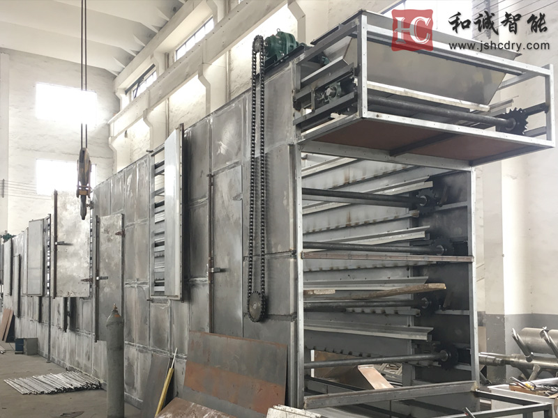 多层穿流带式干燥机常用于干燥速度要求较低、干燥时间较长,在整个干燥过程中工艺操作条件能保持恒定的场合。层间设置隔板以组织干燥介质的定向流动,使物料干燥均匀。多层带干机占地少,结构简单,广泛使用于干燥谷物类物料。由于操作中要多次装料和卸料,因此不适用于干燥易粘着输送带及不允许碎裂的物料。