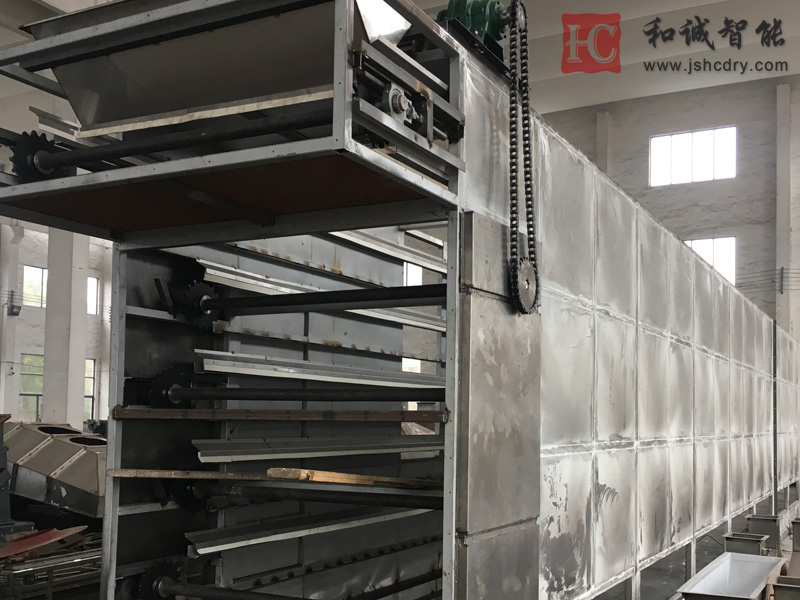 多层穿流带式干燥机的两端设有送料装置和出料口,设备顶部安装排湿装置。送料装置的一端安装送风机和空气加热器,干燥主机内设置有多层由上而下组成干燥网带,每层干燥网带的两端均设有传动轴,两侧安装的传动链条与网带相固定联接,依靠链轮传动装置运转。外界冷空气由送风机经热交换器加热后吹入干燥机,热风由下而上依次穿透网带和物料层。至上层网带时,湿空气被排湿风机通过排风管带出。