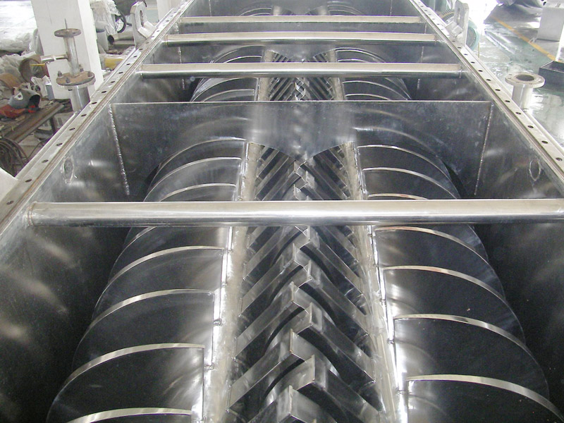 有些湿物料粘度高,流动性差,为了使这类物料向前流动,普通桨叶干燥机安装时设备整体向出料口方向成一定倾角,但是当设备倾斜放置时 不能很好控制物料的流动速度,这样很难控制物料干燥水份,为了提高湿物料在桨叶干燥机内部流动性,对桨叶的外部结构作了一定的改动,使桨叶对物料有向前推进作用。改变桨叶轴转速就可控制物料的推进速度,使物料有一个合理的推进速度,保持物料在设备内部有一个合理的料位,使物料与桨叶表面充分接触,进一步提高传热面积。
