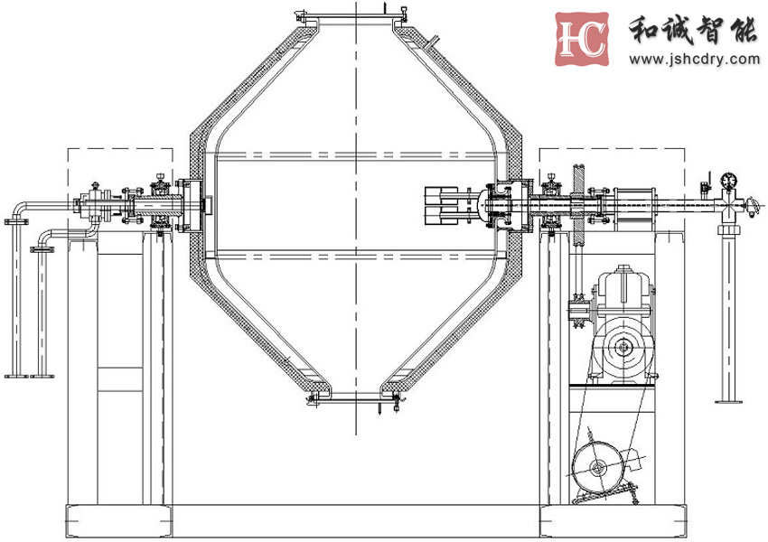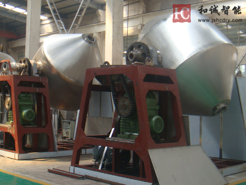 双锥回转真空干燥机为双锥形的回转罐体,罐内在真空状态下,向夹套内通入蒸汽或热水进行加热,热量通过罐体内壁与湿物料接触,湿物料吸热后蒸发的水汽,通过真空泵经真空排气管被抽走。由于罐体内处于真空状态,且罐体的回转使物料不断的上下内外翻动,故加快了物料的干燥速度,提高干燥效率,达到均匀干燥的目的。双锥回转真空干燥机系统主要由双锥回转真空干燥机、冷凝器、除尘器、真空抽气系统、加热系统、冷却系统、电控系统等组成。