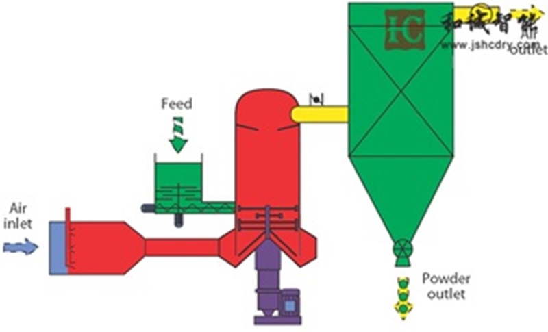 闪蒸干燥机是由热空气切线进入干燥器底部,在搅拌器带动下形成强有力的旋转风场。物料由螺旋加料器进入干燥器内,在高速旋转搅拌桨的强烈作用下,物料受撞击、磨擦及剪切力的作用下得到分散,块状物料迅速粉碎,与热空气充分接触、受热、干燥。湿含量较低及颗粒度较小的物料随旋转气流一并上升,输送至分离器进行气固分离,成品收集包装,而尾气则经除尘装置处理后排空。